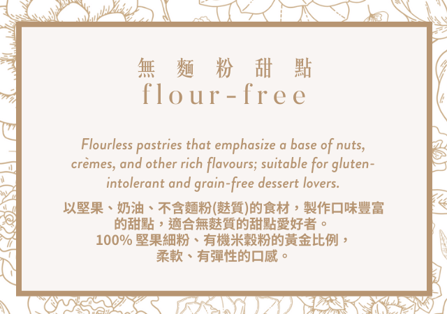 使用頂級佳麗寶黑巧克力、鐵塔牌發酵奶油,製成滑順輕柔,恰似生巧克力般入口即化的口感,搭配當季鮮果,適合低碳飲食的朋友。